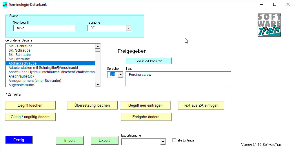 Das Terminologieprogramm ist eine Datenbank für deutsche Begriffe und ihre freigegebenen Übersetzungen. Fest angelegt sind 26 Sprachen, es können aber jederzeit neue Sprachen hinzugefügt werden.